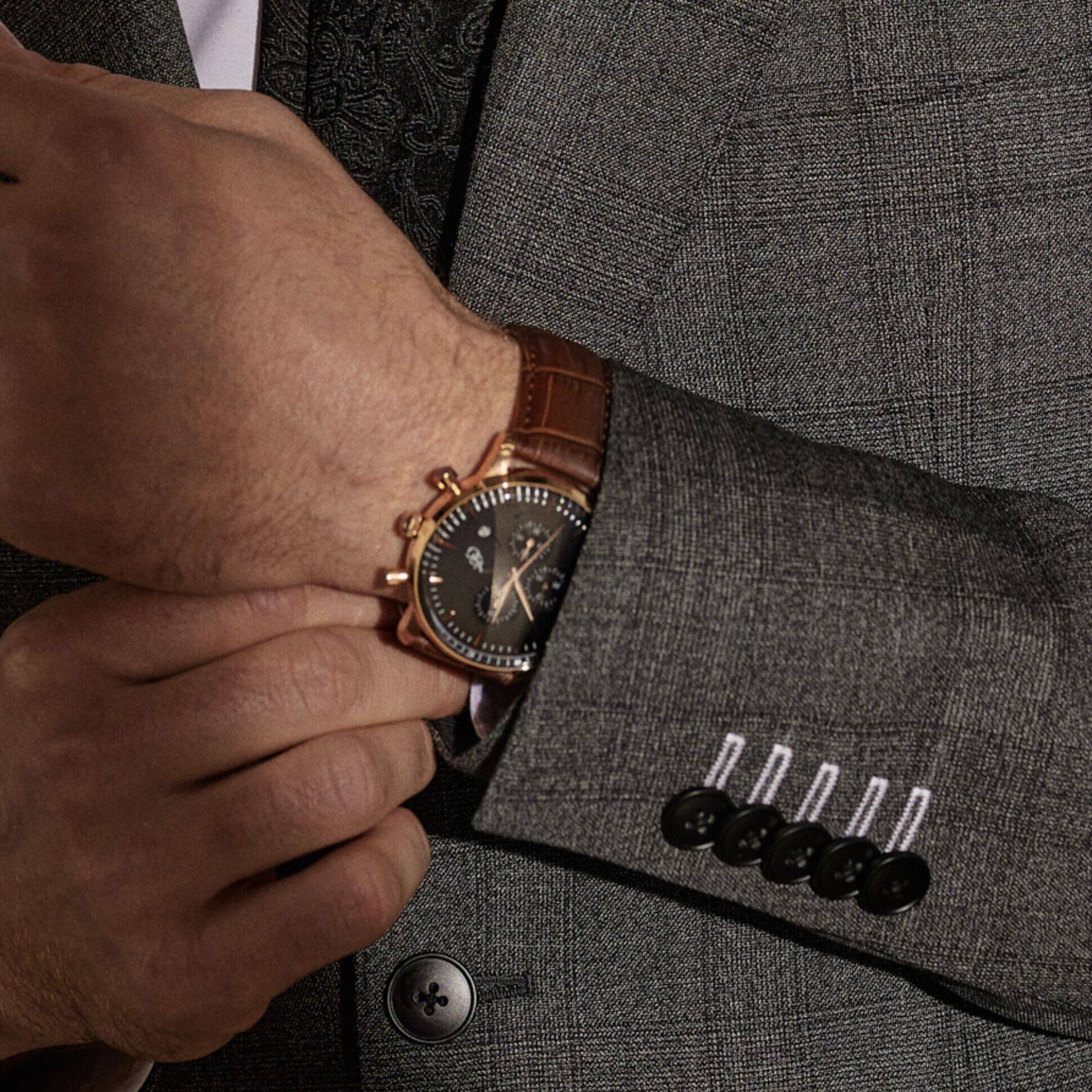 Introducing our sleek and stylish 316L stainless steel watch, complete with a black dial, gold case, and brown strap. With a 43mm case diameter, 12mm case thickness, and 22mm band width, this watch is the perfect balance of form and function.
