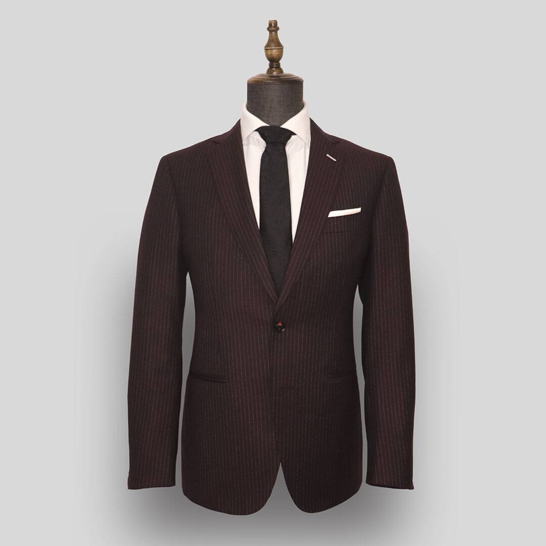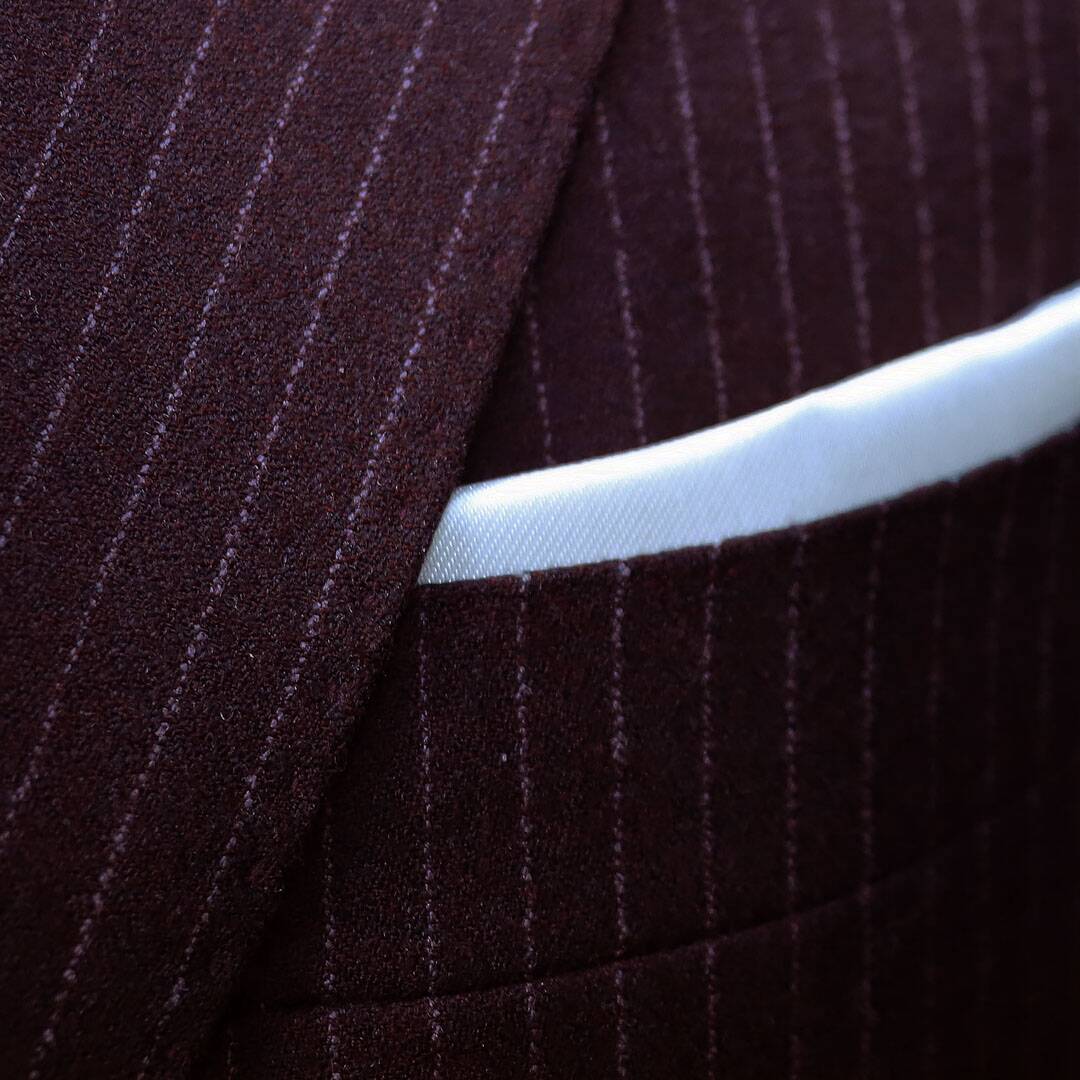 The Dunstall is a classic single breasted jacket in an unusual burgandy wool fabric with a chalk stripe. It adds some underestated style and elevates the suit.