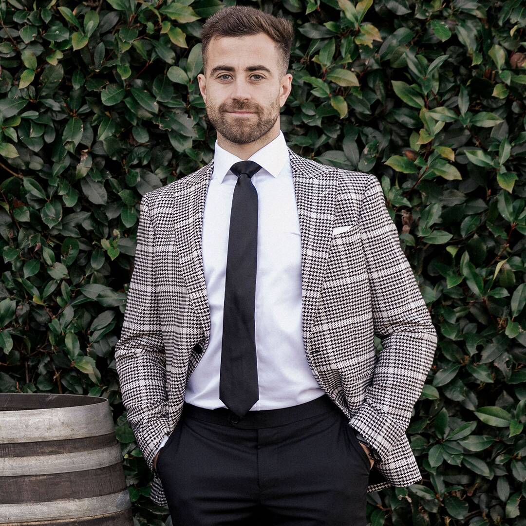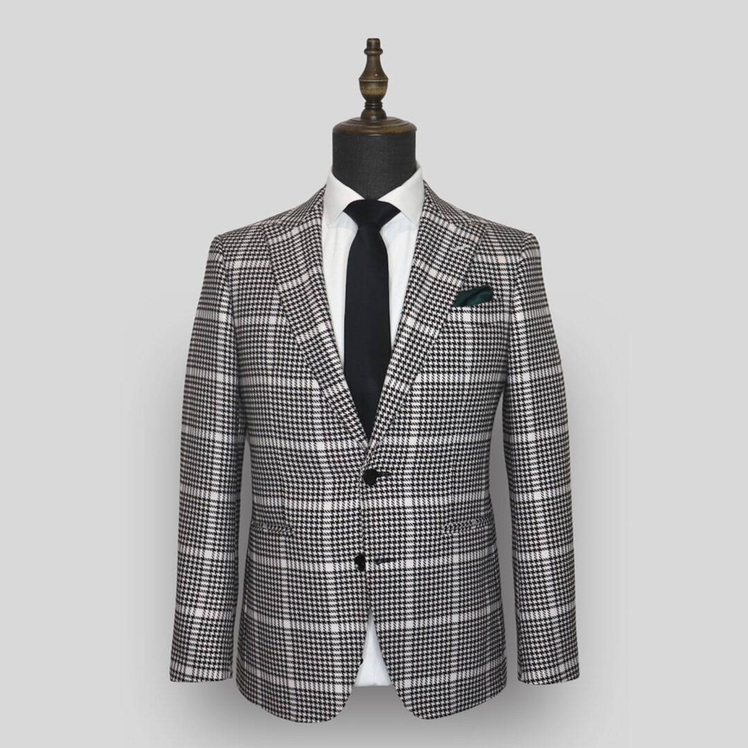 The Derby shown in a striking houndstooth check. The rest of the suit keeps it simple and allows the fabric to speak for itself.