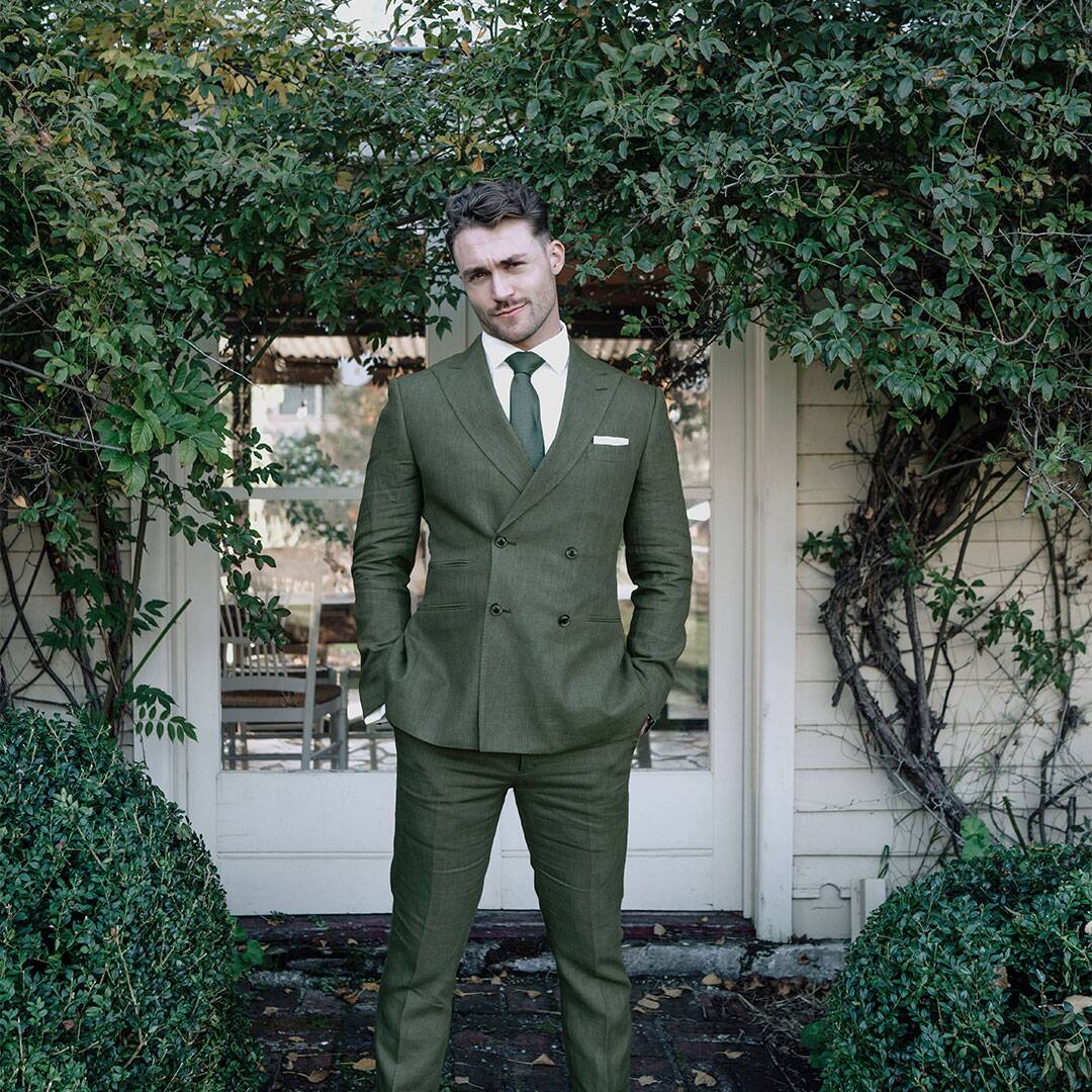 The Llyod combines a bold double-breasted, peak lapel design with softer elements such as the green linen fabric to create a unique suit. Perfect for summer weddings that are a bit more formal.